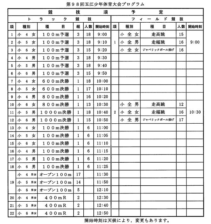 第98回玉江少年体育大会 スタートリスト掲載しました。